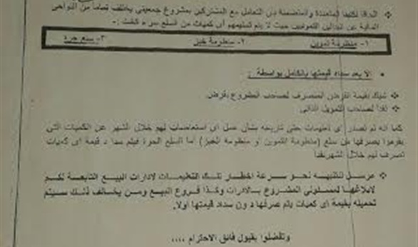 الحاقا لكتبنا المتعددة والمتضمنة بأن التعامل مع المشتركين بمشروع جمعيتي يختلف تماما من النواحي المالية عن البدالين التموينين، حيث لا يتم تسليمهم أي كميات من السلع سواء: منظومة تموين أومنظومة خبز أو سلع حرة إلا بعد سداد قيمتها بالكلام من خلال شيك بقيمة القرض المنصرف لصاحب المشروع (القرض)، أو نقد لصاحب المشروع (تمويل ذاتي).