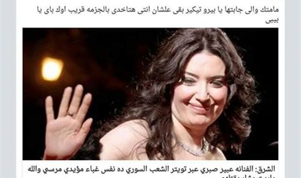 ونشرت "عبير"، صورة من الموضوع علي صفحتها الخاصة بـ"الفيس بوك" وعلقت: "فيه حاجه اسمها الشرق معرفش دي موقع ولا جريده ولا قناه كاتبه اني بحرض الرئيس السوري بشار الاسد يقتل شعبه ومستشهدين باكونت بتاعي علي تويتر ..وقايلين انهم هايدوني بالجزمه ...طيب اولا ..معنديش اكونت علي تويتر ثانيا ..ادعم سوريا وشعبها وجيشها وادعوا الله ان يخلص سوريا وشعبها من تلك المحنه والبلاء ويرفعها عنهم .. ولا ارضي عن مايحدث لهم ثالثا ..لااقبل ان يزج اسمي ويزايد عليه في قضايا سياسية لان متابعيني وجمهوري يعرف ارائي ..ولا يستمع لاخبار تحت بير السلم ..شكرا#تحت_بير_السلم#فبركه".