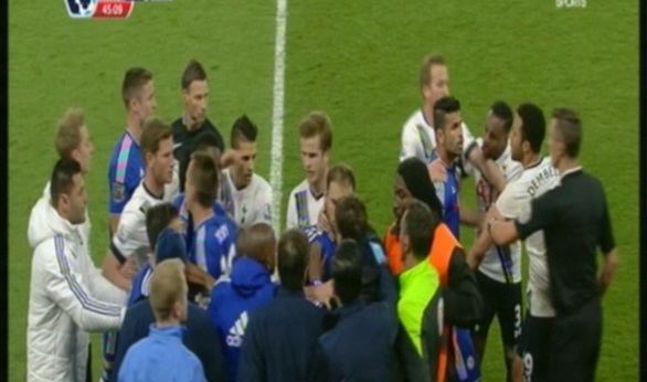 تدخل الأرجنتينى ماوريسيو بوكيتينو المدير الفنى لفريق توتنهام هوتسبير لفض اشتباك عنيف نشب بين لاعبه روز والبرازيلى ويليان نجم تشيلسى فى الدقيقة الأولى من الوقت بدل الضائع من زمن أحداث الشوط الأول للمباراة التى تجمع الفريقين حالياً على ملعب ستامفورد بريدج , فى اطار منافسات الجولة الـ36 من الدورى الإنجليزى الممتاز.
