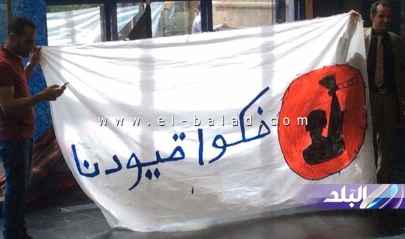 حيث وضع عمال نقابة الصحفيين اللافتات على واجهة النقابة، وذلك احتجاجا على الحصار الأمنى واقتحام قوات الأمن للمبنى والقبض على زميلين داخلها.