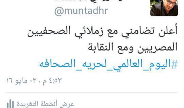 وقال "الزيدي" متضامنا: "كرفاق القضية في أمة واحدة تنشد الحرية و نصرة المظلوم ، نقف إجلالًا لدور الصحافة المصرية العريقة في نشر ثقافة الرأي المختلف الموضوعية في الطرح"
