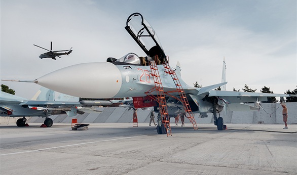 ورفعت القوات الروسية في قاعدة حميميم العلم الروسي وعلم النصر في الحرب العالمية الثانية وقاموا بغناء النشيد الوطني. وتم استعراض لمركبات مدرعة ومعدات عسكرية بما فيها منظومة الدفاع الجوي إس-400 الدفاعي "تريومف" أثناء الموكب المصغر.