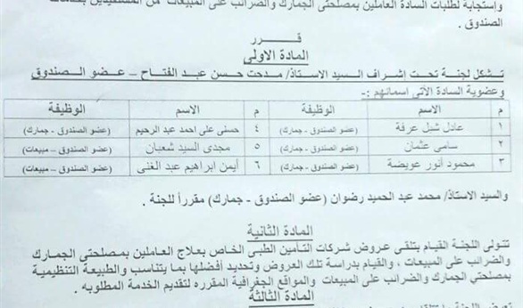 وتم اختيار كل من (عادل عرفة،سامي عثمان،محمود عويضة،حسني عبد الرحيم،مجدي السيد شعبان،أيمن ابراهيم عبد الغني) اعضاء الصندوق من مصلحتي الجمارك والضرائب علي المبيعات.