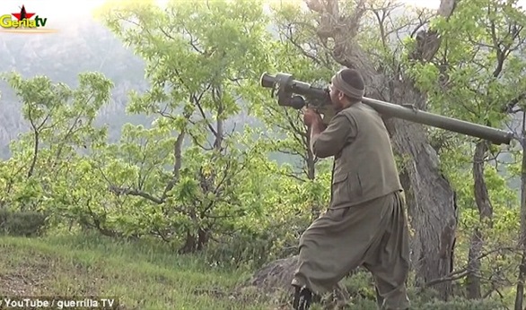 ويظهر الفيديو مروحية تحلق فوق بعض الجبال، ويبدو أنها في وضع استعداد للهجوم، ولكن مقاتلين أكراد أسقطوها بصاروخ محمول على الكتف.