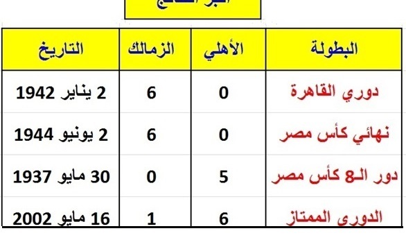 وفاز الزمالك على الأهلي بنتيجة 6-0 المرة الأولى في بطولة دوري القاهرة بتاريخ 2 يناير 1942.