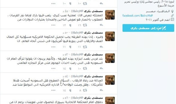 واختتم بكري تغريداته مؤكدا على "أن المملكه تتعرض الان لعملية نصب كبري يلعب فيها بارك اوباما دور القرصان ، المطلوب باختصار هو تعويض الناجين والضحايا بمليارات الدولارات من قيمة الاموال السعوديه في البنوك الامريكيه ، هذه فضيحة امريكيه جديده تذكرنا بعمليات المافيا" - بحسب قوله.