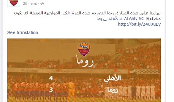 قدم نادي روما الإيطالي عبر صفحته الرسمية على موقع «فيسبوك»، التهنئة للنادي الأهلي عقب فوزه في المباراة الودية التي جمعت بين الفريقين بأربعة أهداف مقابل ثلاثة.
