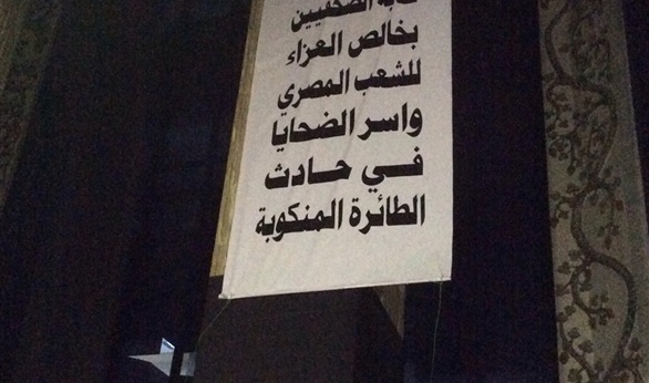 وضعت نقابة الصحفيين لافته كبيرة على جدران المبنى، لتعزية الشعب المصرى وأسر الضحايا فى الحادث الأليم لطائرة مصر للطيران اثناء رحلتها القادمة من باريس الى القاهرة.