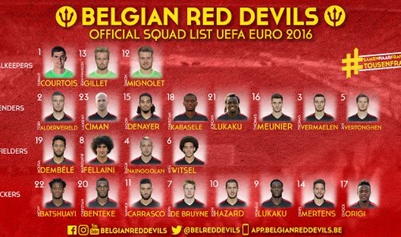 أعلن مارك فيلموتس المدير الفني للمنتخب البلجيكي قائمة الفريق النهائية المشاركة في بطولة كأس الأمم الأوروبية التي ستقام بفرنسا في العاشر من الشهر القادم.