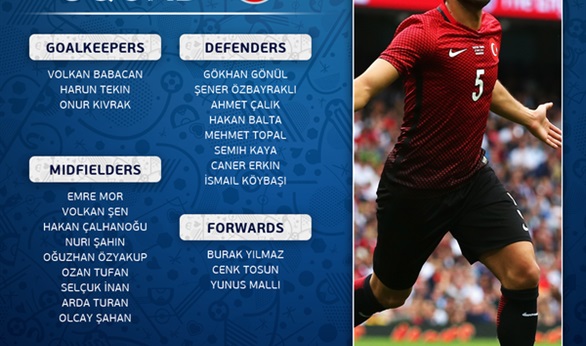 كشف الاتحاد التركي لكرة القدم عن قائمة الفريق التي ستخوض منافسات بطولة كأس الأمم الأوروبية المقرر انطلاقها في العاشر من الشهر القادم بفرنسا.