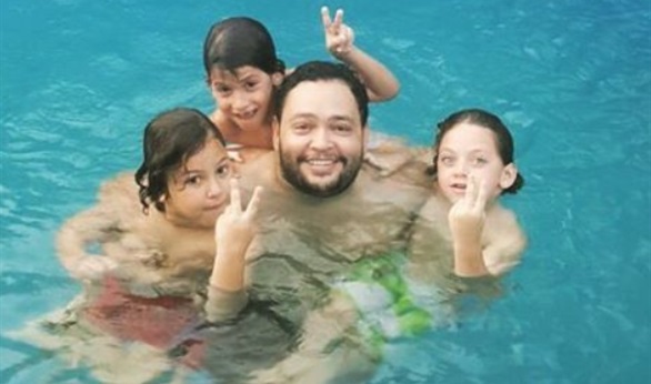 شاهد.. أحمد رزق مع أبنائه الثلاثة في حمام السباحة