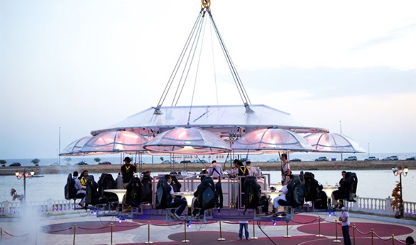 ويعد كل عام عشرة طهاه أطباقا على المنصات المعلقة في الهواء حول "الأتوميوم" ويقدموها للضيوف الجالسين على مناضد طويلة.