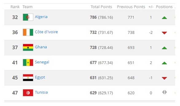 11- نتائج منتخب مصر في هذه الفترة خاض 5 مباريات ، فاز 3 مباريات وتعادل مباراتين ولم يخسر أي مباراة ، أما نتائج منتخب تونس في هذه الفترة خاض 4 مباريات ، فازت مباراتين فقط وتعادلت مباراة وخسرت مباراة، بما يعني أن نتائج منتخب مصر أفضل كثيرا في هذه الفترة ، وبالتالي عند تقليل نسبة نقاط هذه المباريات في الحسابات الجديدة في التصنيف المقبل قد تتأثر مصر بالسلب أكثر من تونس ، وهو ما قد يصب في صالح المنتخب التونسي ، وقد يقفز للتصنيف الأول بدلا من منتخب مصر لأن الفارق بينهما ضئيل جدا في الوقت الحالي.