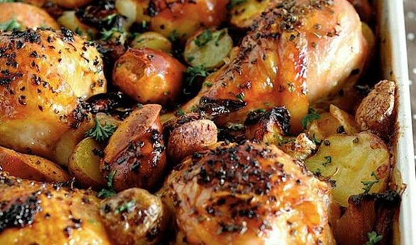 5 - تقشر حبات البطاطس، وتوزع على صينية الدجاج.