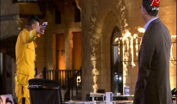وخشى عامر من مقالب رامز جلال عندما عرض عليه أخذ المسدس وتصويب الطلقات إليه ، معتبرا ذلك حيلة يستخدمها رامز فى برنامجه " رامز بيلعبب بالنار " الذى سيذاع خلال شهر رمضان ، واخذ الطرفان تبادلان إطلاق الطلقات حتى تسببت واحدة فى إشعال جزء من الاستوديو كحيلة ومقلب من رامز جلال .