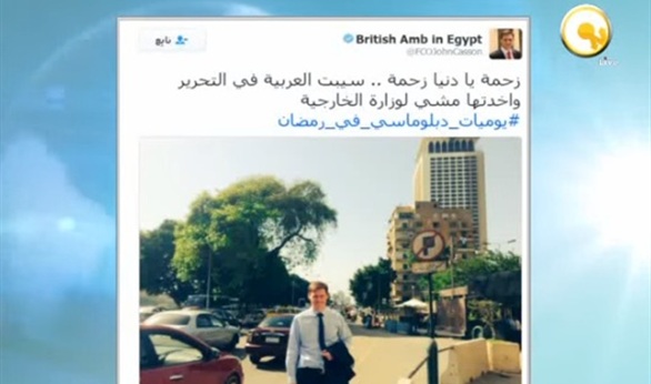 جدير بالذكر أن السفير البريطاني جون كاسن لديه مشاركات عبر موقع التواصل الاجتماعي "تويتر" عبر خلالها عن مدى حبه لمصر وطريقه معايشته للحياة المصرية تحت هاشتاج "يوميات دبلوماسي في رمضان".