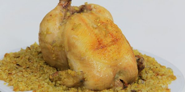 - ضعى خليط الفريك مع الدجاجة المحشية المسلوقة فى صينية.
