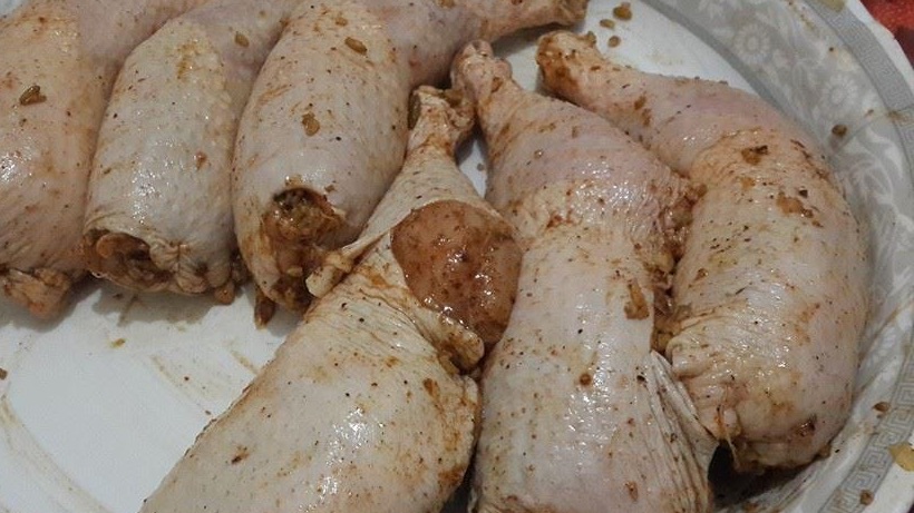 -نتبل الاوراك بالملح والفلفل الاسود ونحشيها بالارز ونقفلها بخلة اسنان ونلف كل ورك فى ورقة المونيوم ونقفل الاطراف جيدا.