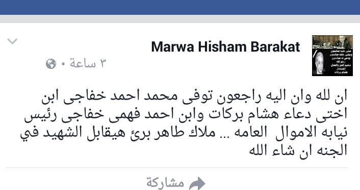 ونعت المستشارة مروة بركات ابنة المستشار الشهيد طفل شقيقتها عبر صفحتها الشخصية على موقع التواصل الاجتماعى فيسبوك: انا لله وانا إليه راجعون توفي محمد احمد خفاجى ابن اختى دعاء هشام بركات وابن احمد خفاجى رئيس نيابة الاموال العامة.. ملاك طاهر هيقابل الشهيد في الجنة ان شاء الله".