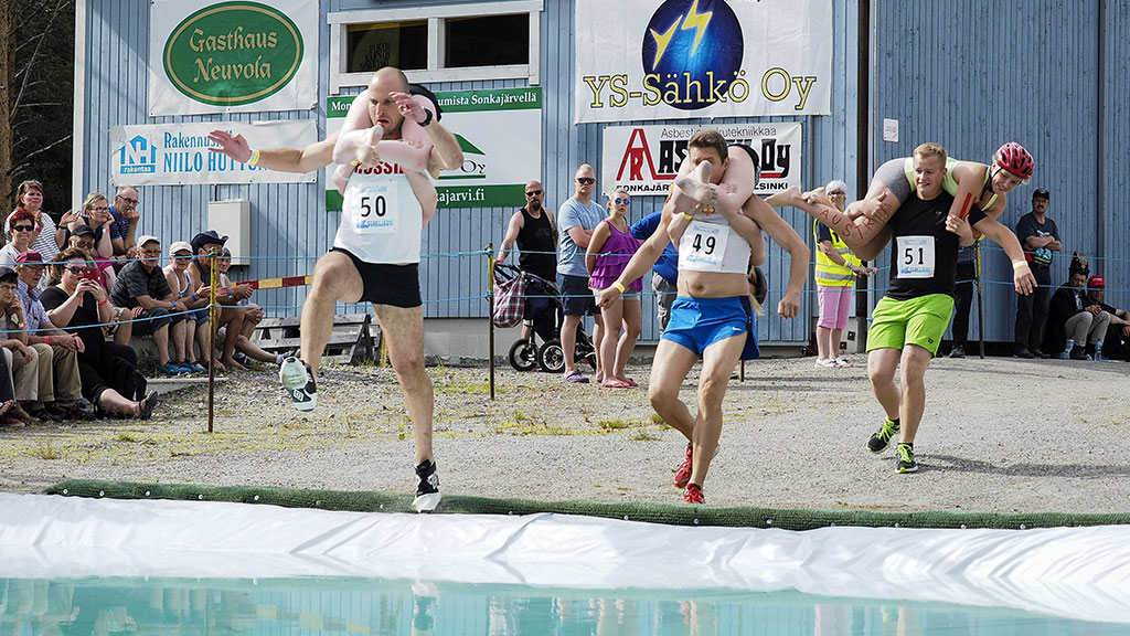 شارك نحو 50 زوجا وزوجة فى سباق فريد يعتمد على قدرة الزوج فى حمل الزوجة والجري والخوض بها عوائق مائية، وقد تخللت البطولة التي أقيمت فى فلندا سباقات حمل الزوجات وأكثر الزوجات أناقة ومسابقة أقوي رجل وسباق السرعة .