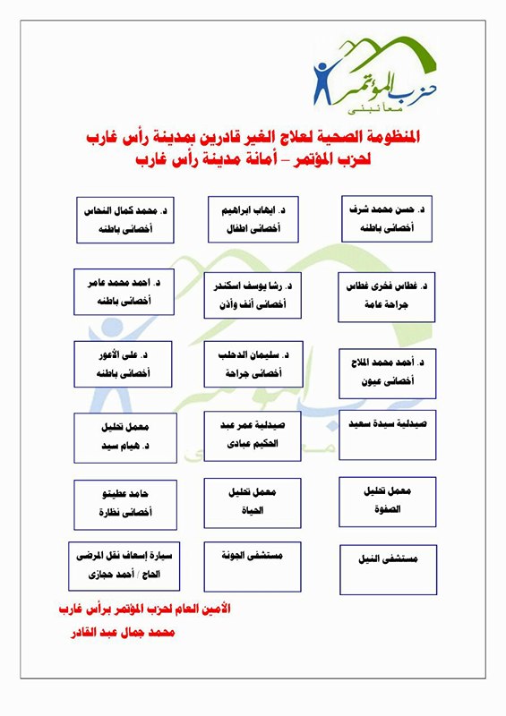 أعلنت أمانه حزب المؤتمر برأس غارب برئاسة محمد جمال عبد القادر عن بدء عمل المنظومة الصحية لغير القادرين وذلك بناء على توجيهات الربان عمل صميدة رئيس الحزب بتوفير العلاج لغير القادرين بأمانات الحزب بالمحافظات.