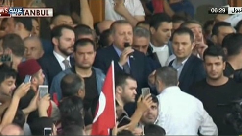 ظهر الرئيس التركي رجب طيب أردوغان منذ قليل، بين حشود من أنصاره ومؤيديه في إسطنبول، حيث ندد «أردوغان» بالإنقلاب الذي نفذها العسكريون ضده، وصفهم بـ «الخونة».