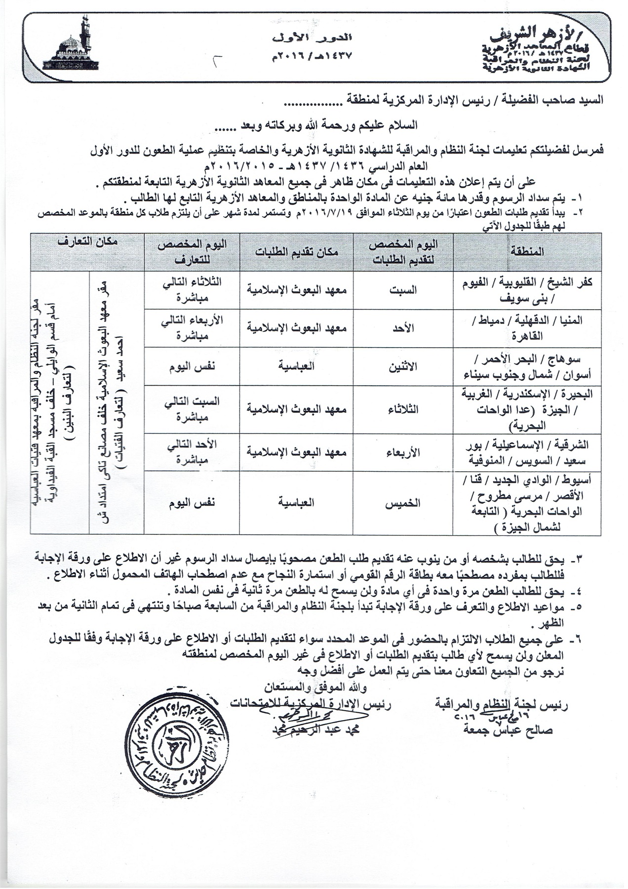 تقرر فتح باب التظلمات للدور الأول لطلاب الشهادة الثانوية الأزهرية بعد غد علي أن يستمر التقديم لمدة شهر من تاريخه.
