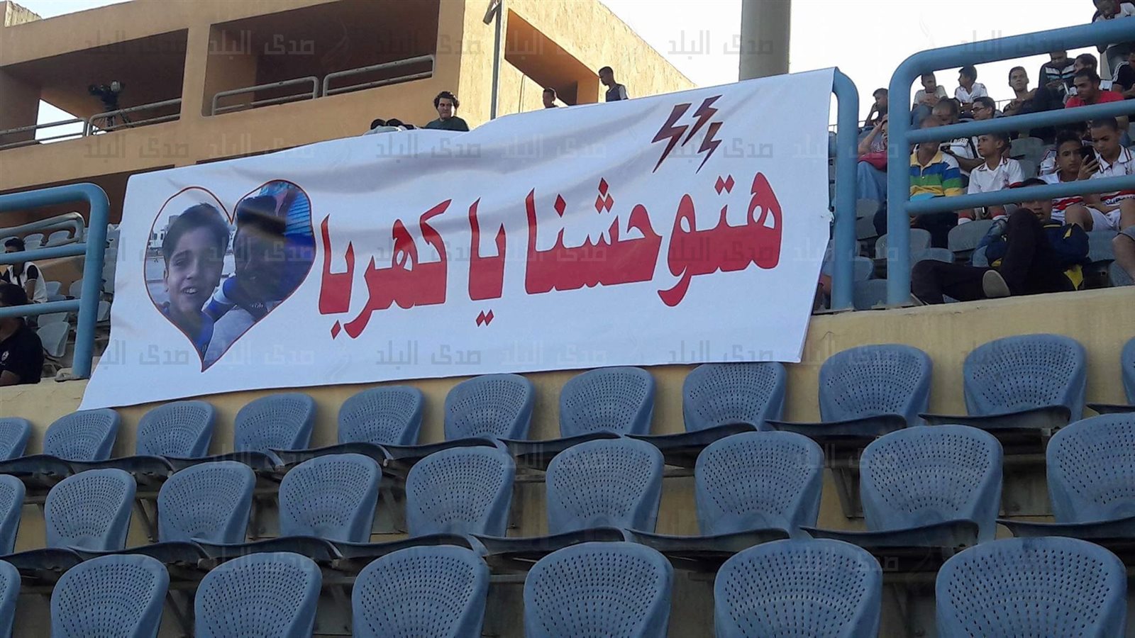 حرصت جماهير نادي الزمالك المتواجدة حاليا بملعب بتروسبورت، على رفع لافتة عليها صورة صانع ألعاب الزمالك ، محمود كهربا، كتب فيها "هتوحشنا ياكهربا" .