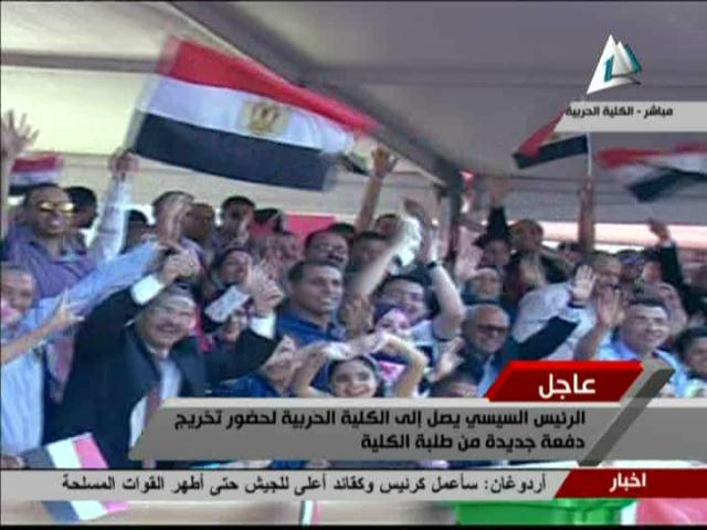 أطلق أهالي طلبة الكلية الحربية وطلبة المعهد الفني للقوات المسلحة، الزغاريد والتصفيق الحاد، لحظة وصول الرئيس عبد الفتاح السيسي، لحضور حفل تخرج دفعة جديدة من الطلبة، وتواكب ذلك مع هتافات الأهالي «تحيا مصر».