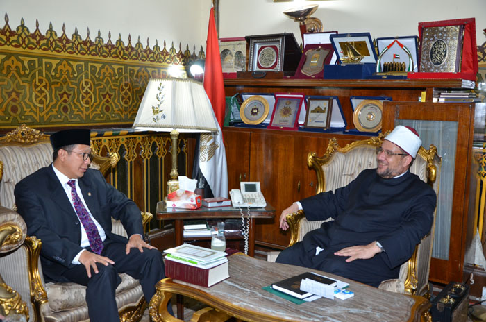 استقبل وزير الأوقاف الدكتور محمد مختار جمعة وزير الشئون الدينية والأوقاف الإندونيسي، لقمان حكيم سيف الدين، والسفير حلمي فوزي سفير إندونيسيا بالقاهرة، والدكتور مخلص حنفي، والدكتور عثمان شهاب الملحق الثقافي والتربوي بإندونيسيا، والوفد المرافق لهم لبحث أوجه التعاون بين وزارة الأوقاف المصري ، ووزارة الشئون الدينية بإندونيسيا.