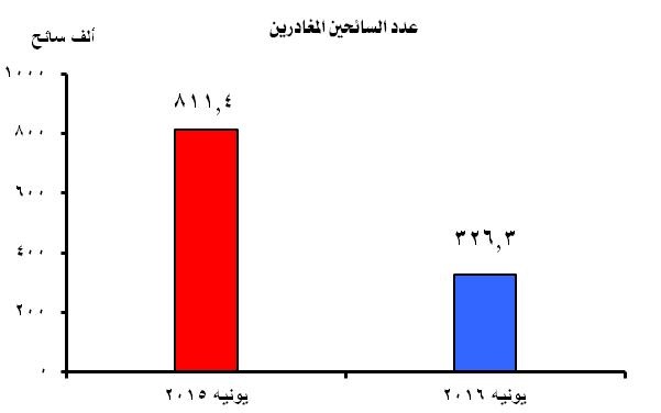 فيما بلغ عدد السائحين المغادرين 326.3 ألف سائح خلال شهر يونيو 2016 مقابل 811.4 ألف سائح خلال شهر يونيو 2015 بنسبة انخفاض قدرها 59.8%.