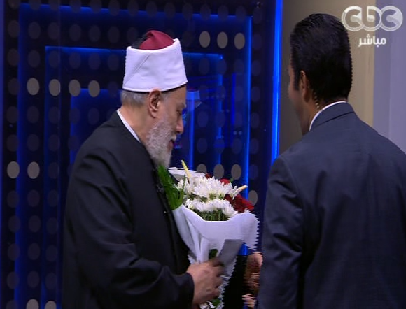 وقدم الإعلامي عمرو خليل، «بوكيه ورد»، وأصر المفتي السابق أن يضع الورد أمامه على المكتب، مشيرًا إلى أن الرسول -صلى الله عليه وسلم- كان لا يرد ثلاث هدايا: «الوسادة والعطر والريحان»، كان -عليه الصلاة والسلام يحبها.