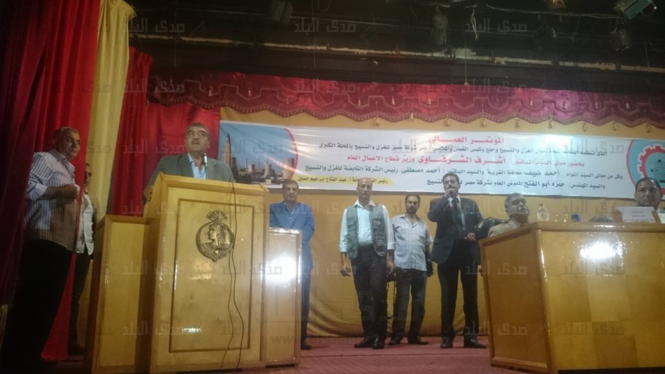 جاء ذلك في مؤتمر عمالي حاشد نظمته النقابة العامة للغزل والنسيج بحضور الدكتور أشرف الشرقاوي وزير قطاع الأعمال والدكتور أحمد مصطفي رئيس الشركة القابضة للصناعات الغزل والنسيج والمهندس حمزة أبوالفتح المفوض العام لشركة غزل المحلة واللواء أحمد ضيف صقر محافظ الغربية بمسرح غزل المحلة.