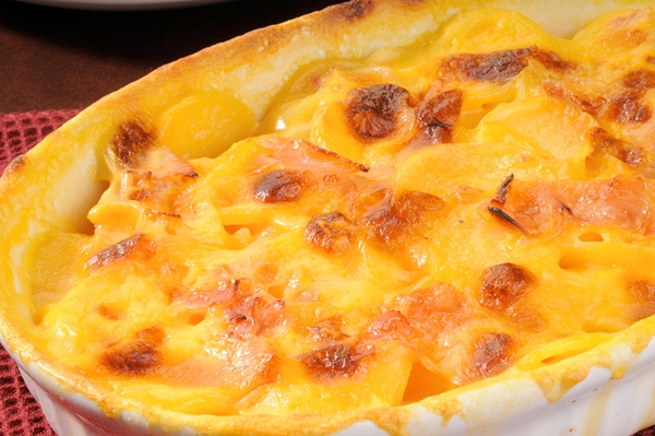 * غطيه بطبقة اخرى من البطاطس وادخليه الفرن حتى يحمر الوجه ثم قدميها ساخنة