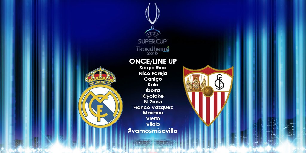 أعلن الارجنتيني خورخي سامباولي مدرب اشبيلية الاسباني عن التشكيلة الرسمية لفريقه الاندلسي لمباراة كأس السوبر الأوروبي التى ستنطلق بعد قليل أمام ريال مدريد في النرويج.