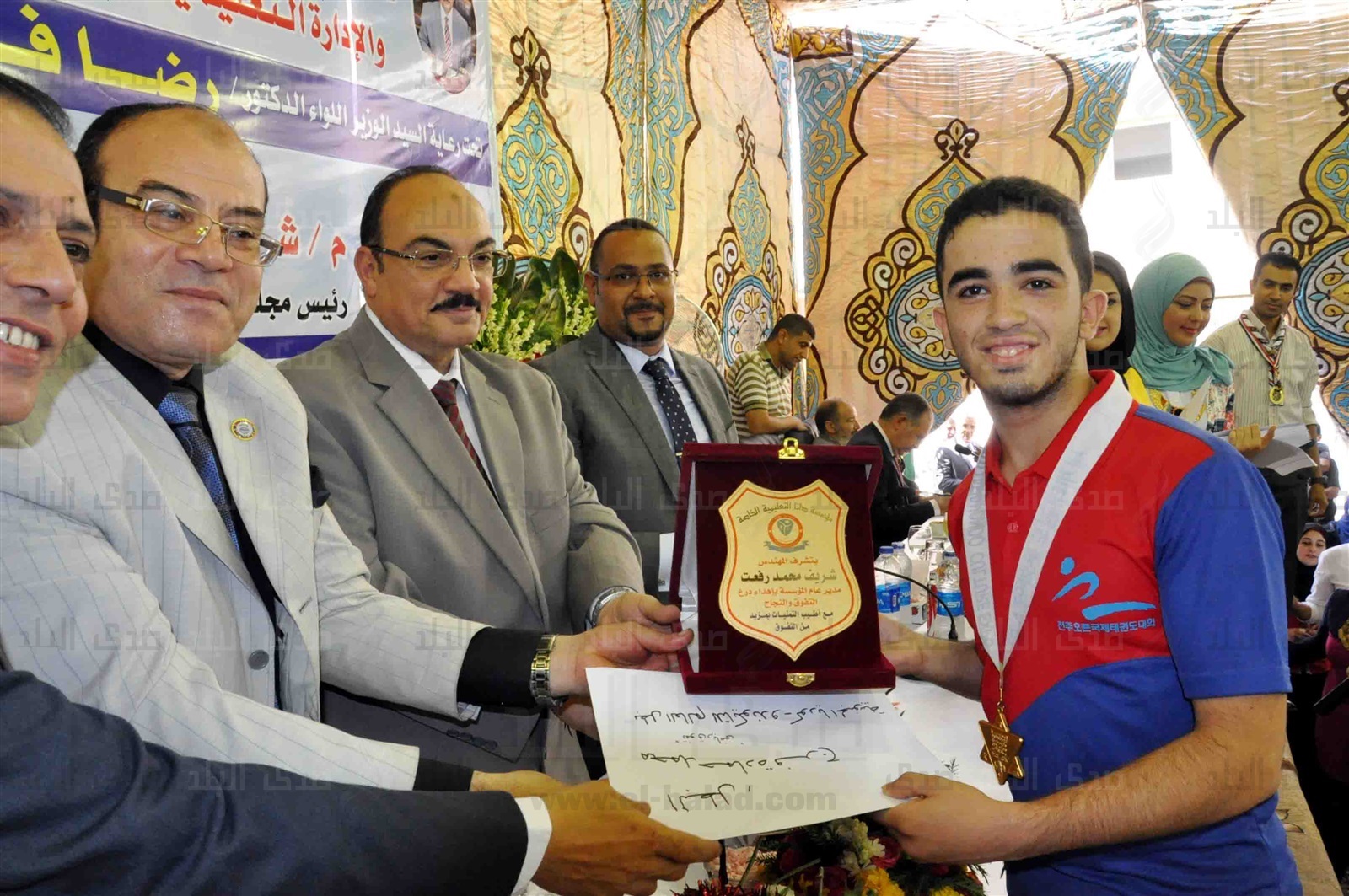 وكرم المحافظ خلال الاحتفال اوائل المراحل الابتدائية و الإعدادية والمدارس الخاصة واللغات كما تم تكريم 28 طالبا من فريق الكورال من جميع المراحل التعليمية وتكريم البطل عبدالعزيز عنتر عبدالعزيز الحاصل على بطولة العالم في الجوالة بالمغرب.