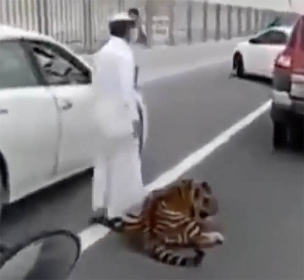 لكن ذلك الموقف المرعب تحول إلى مشهد كوميدى خلال لحظات، حيث خرج رجل من سيارته واقترب من النمر وقام بوضع سلسلة حول رقبته ثم جره فى الشارع وكأنه حيوان أليف، حتى عاد به إلى سيارته، لكن النمر رفض الصعود إلى السيارة وجلس النمر فى وسط الطريق ورفض التحرك والانصياع لأوامر صاحبه.