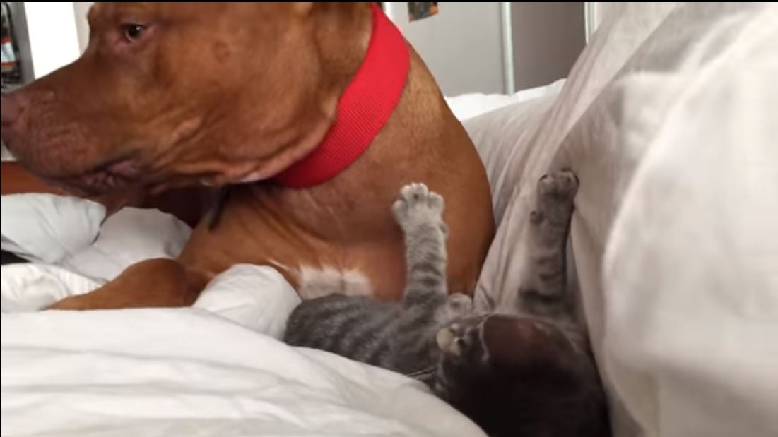 ويظهر الفيديو كيف يلعب القط الصغير مع الكلب، في لقطات يمكن رؤيتها لاول مرة بين الحيوانين.