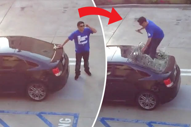 نشرت صحيفة "ديلى ستار" البريطانية مقطع فيديو لشاب قرر الانتقام من صديقته بعد أن اكتشف خيانتها له بطريقة مروعة كادت تودى بحياته، وأظهر الفيديو الشاب وهو يقف أمام سيارة صديقته ثم يقفز فوقها فجأة محطما زجاجها الخلفى، الذى تطاير فى كل مكان وكان من الممكن أن يصيبه.