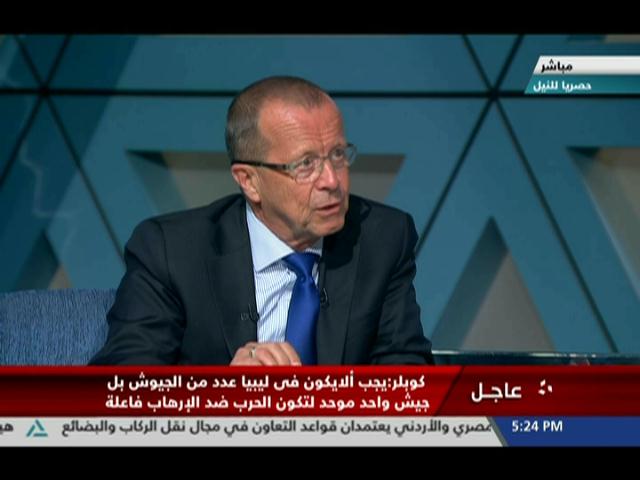 وشدّد "كوبلر" خلال لقائه بالتليفزيون المصري، اليوم السبت، على أن الليبييين وحدهم من يقررون مصيرهم بأنفسهم والأمم المتحدة لا تحكم ليبيا بل تقدم مساعدات دبلوماسية لحل الأزمة فى ليببا.