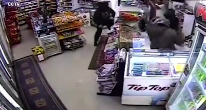 نشرة صحيفة ديلي ميل البريطانية مقطع فيديو يوثق لحظة سطو عصابة على أحد المحال التجارية في نيوزلاندا للسرقة وعند دخول اللصين إلى المتجر توجه إليهم صاحب المتجر وابنته وتمكنا من ردع اللصين وضربهما بعصى حديدية ومطرقة.
