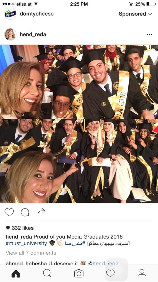 نشرت المذيعة هند رضا من خلال صفحتها على موقع التواصل الاجتماعي "إنستجرام"، صورة جديدة لها مع طلبة كلية إعلام، وعلقت قائلة: "تشرفت بوجودي معكوا وبتكريمي".
