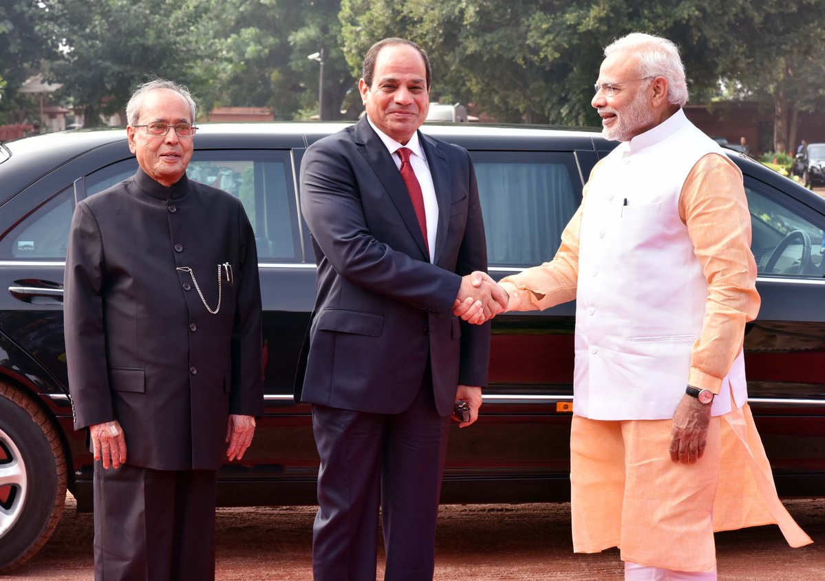 واستعرض الرئيس السيسى ونظيره الهندى برناب موخرجى حرس الشرف بينما أطلقت المدفعية 21 طلقة للترحيب بالرئيس السيسى بحضور رئيس الوزراء "ناريندرا مودى"، .