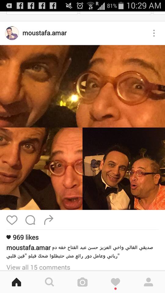 وعلق مصطفي علي الصورة " صديقي الغالي وافي لعزيز حسن عبد الفتاح خفة دم رياني وعامل دور رائع مش حتبطلوا ضحك من فيلم "فين قلبي ".