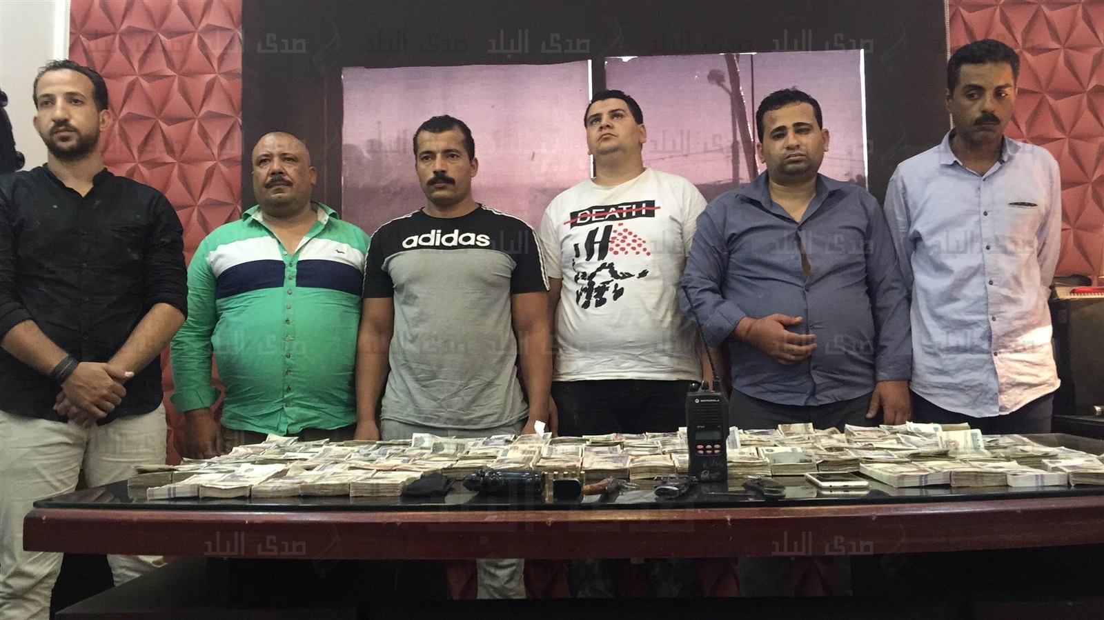 وبإرشاد المتهم الثالث تمكنت وحدات المباحث من ضبط مبلغ مالي 130 ألف جنيه بمكسنه وبإرشاد المتهم الرابع أمكن ضبط مبلغ مالي 130 ألف جنيه بمسكنه وبإرشاد المتهم الخامس أمكن ضبط مبلغ مالي 150 الف جنيه بمسكنه وبإرشاد المتهم الساس أمكن ضبط مبلغ مالي 5000 جنيه بمسكنه وعثر معه علي طبنجة صوت، سلاح أبيض، مطواة قرن غزال.