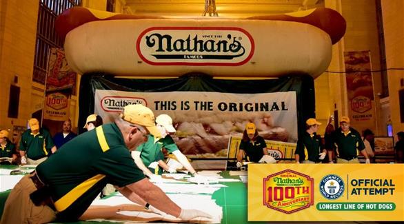 تمكن مطعم “ناثان فيموس” بمدينة نيويورك الأمريكية من تحطيم رقم قياسي فى موسوعة جينيس" للأرقام القياسية لأطول خط من النقانق في العالم بطول بلغ 290 مترًا.