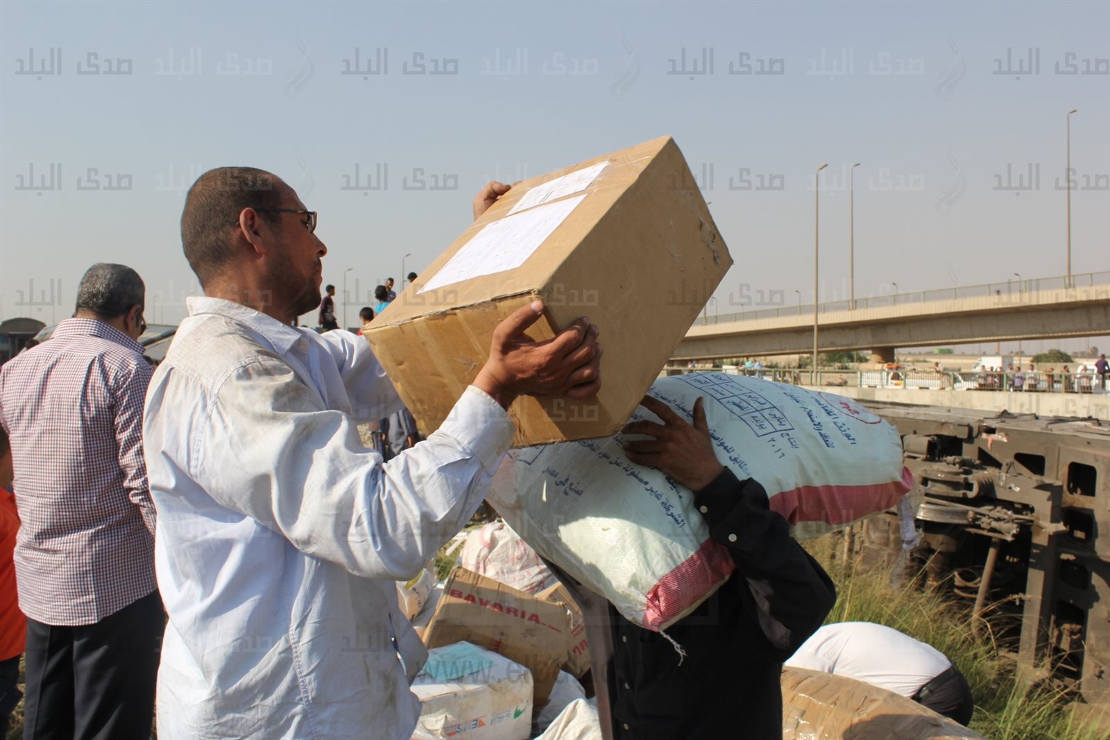 نقل عمال هيئة البريد وأهالى العياط، الطرود التى كانت موجودة بالعربة الثانية من قطار العياط المنكوب، والتى تطايرت على القضبان بعد انقلاب القطار صباح اليوم.
