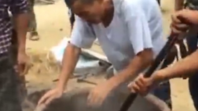 ويظهر الصيني وهو يستعد لوضع الكلب في الماء المغلي، قبل وضع رجلي الكلب في الحوض وسط نباح الكلب الذي حاول الهرِوب دون فائدة.