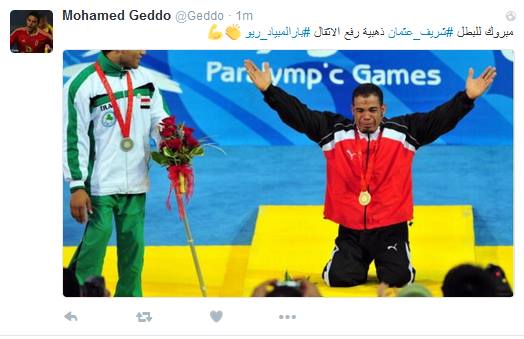 وقال جدو عبر موقع التواصل الاجتماعى :" مبروك للبطل شريف عثمان ذهبية رفع الاثقال فى ريودى جانيرو".