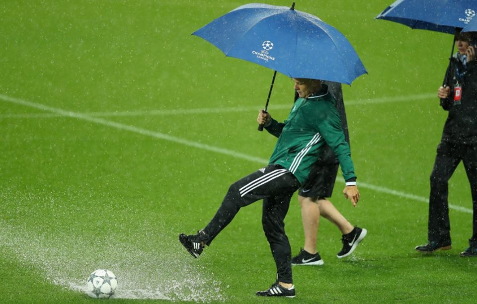 وأمر حكم اللقاء الهولندي بيورن كيبرس اللاعبين بمغادرة أرض الملعب أثناء عمليات الإحماء بعدما قام باختبار سير الكرة على أرض الملعب ليتأكد من عدم إمكانية خوض اللقاء وسط هذه الظروف المناخية الصعبة.